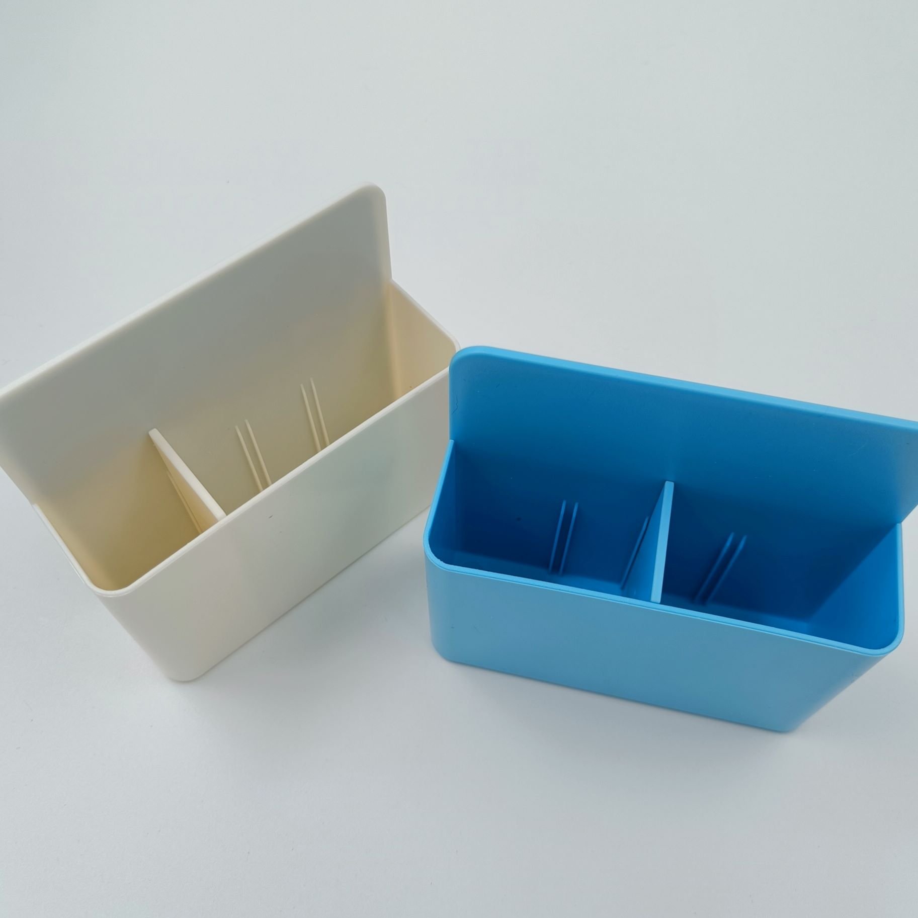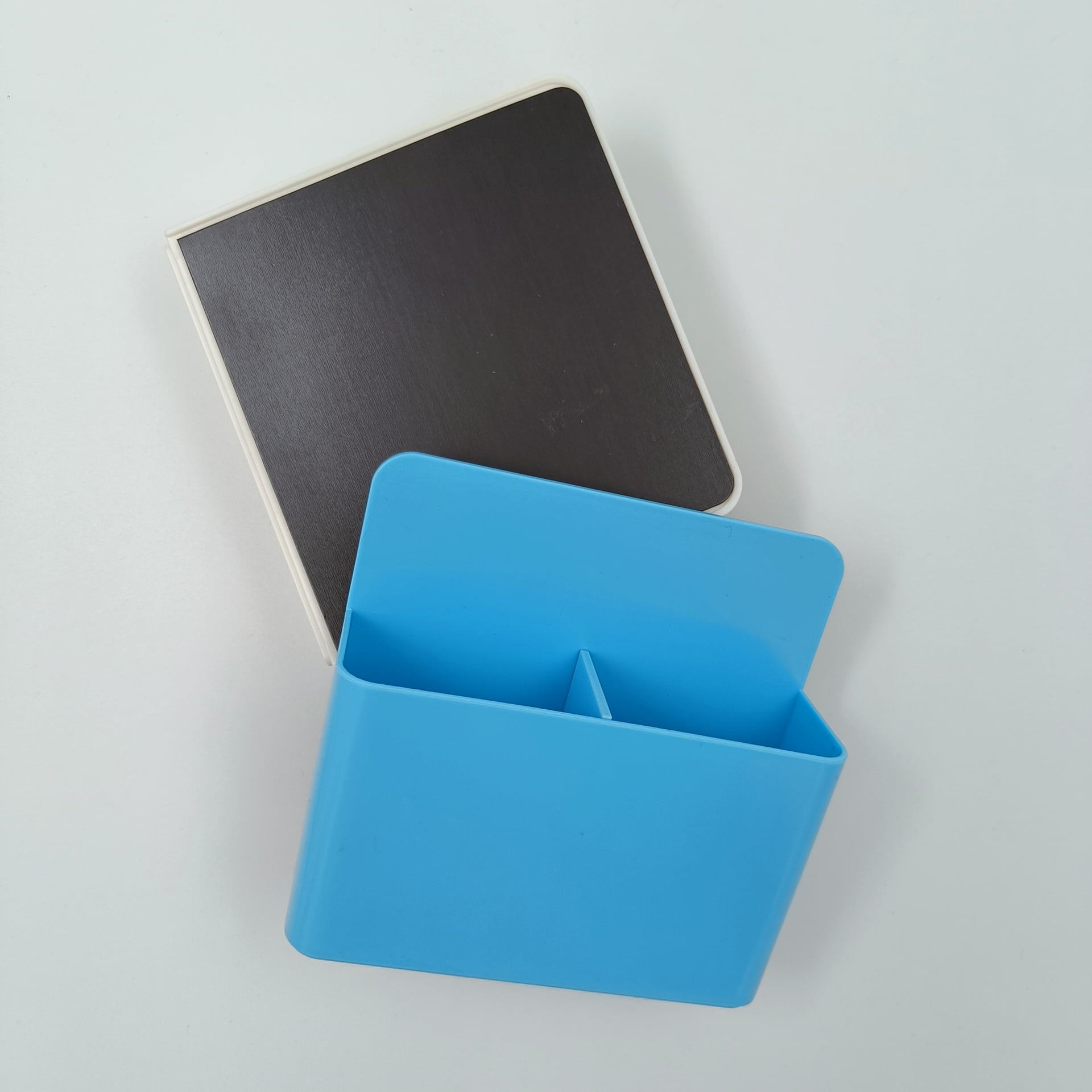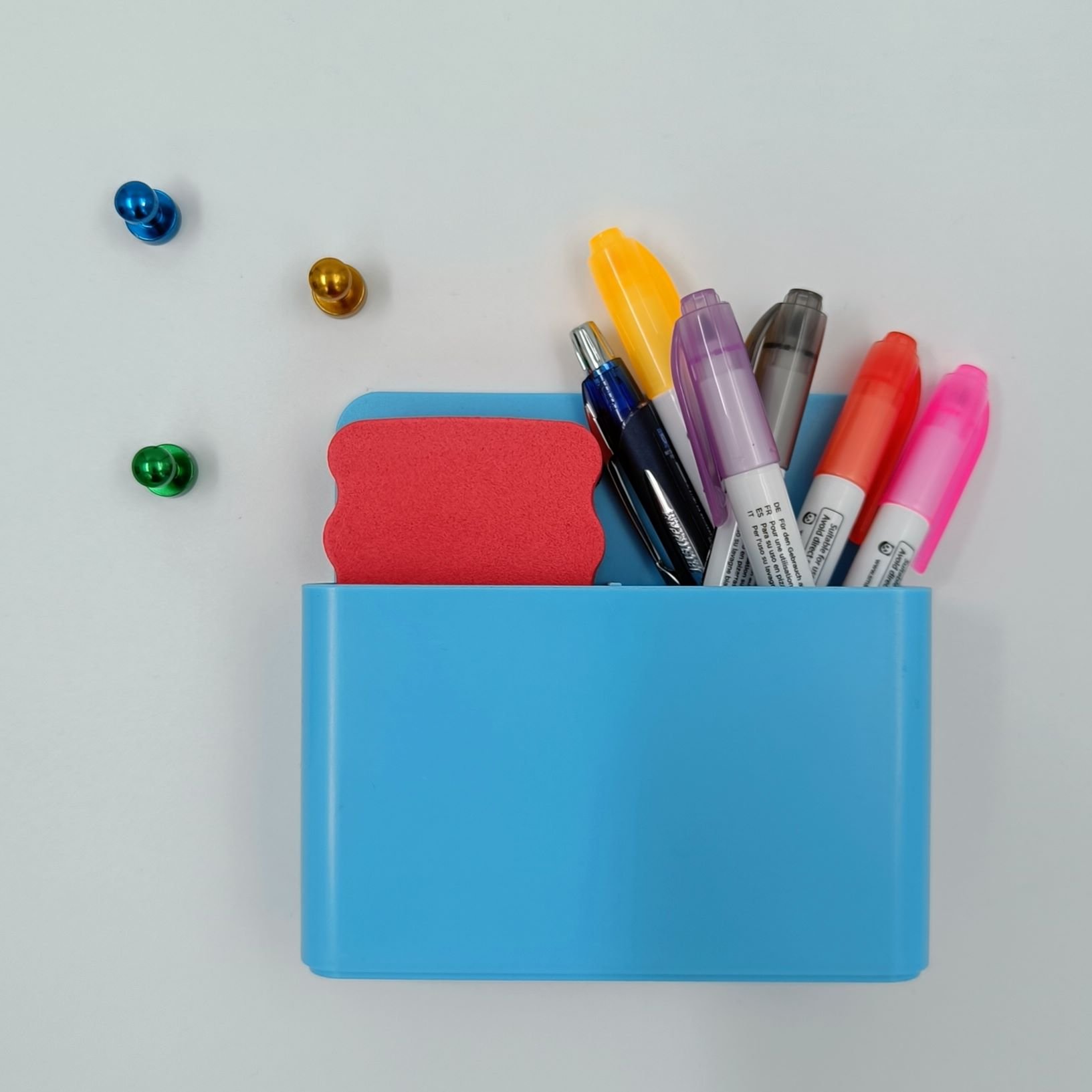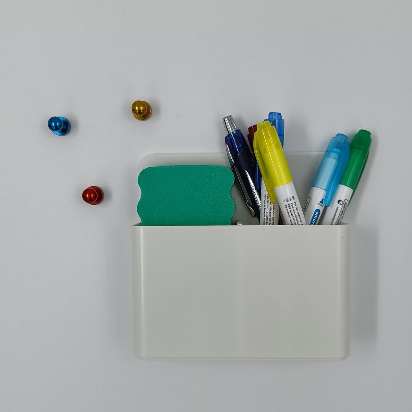 Kätevä kynäteline kevyille esineille, kuten tusseille ja taulupyyhkimille. Kynätelineen kahden lokeron ansiosta saat lajiteltua tavarat kätevästi eri lokeroihin. Lokeroiden koko on säädettävissä siirrettävän jakajan avulla. Kynätelineen taustapuoli on magneettinen ja teline sopii kiinnitettäväksi vaikkapa jääkaapin oveen. Saatavilla valkoisena ja sinisenä.