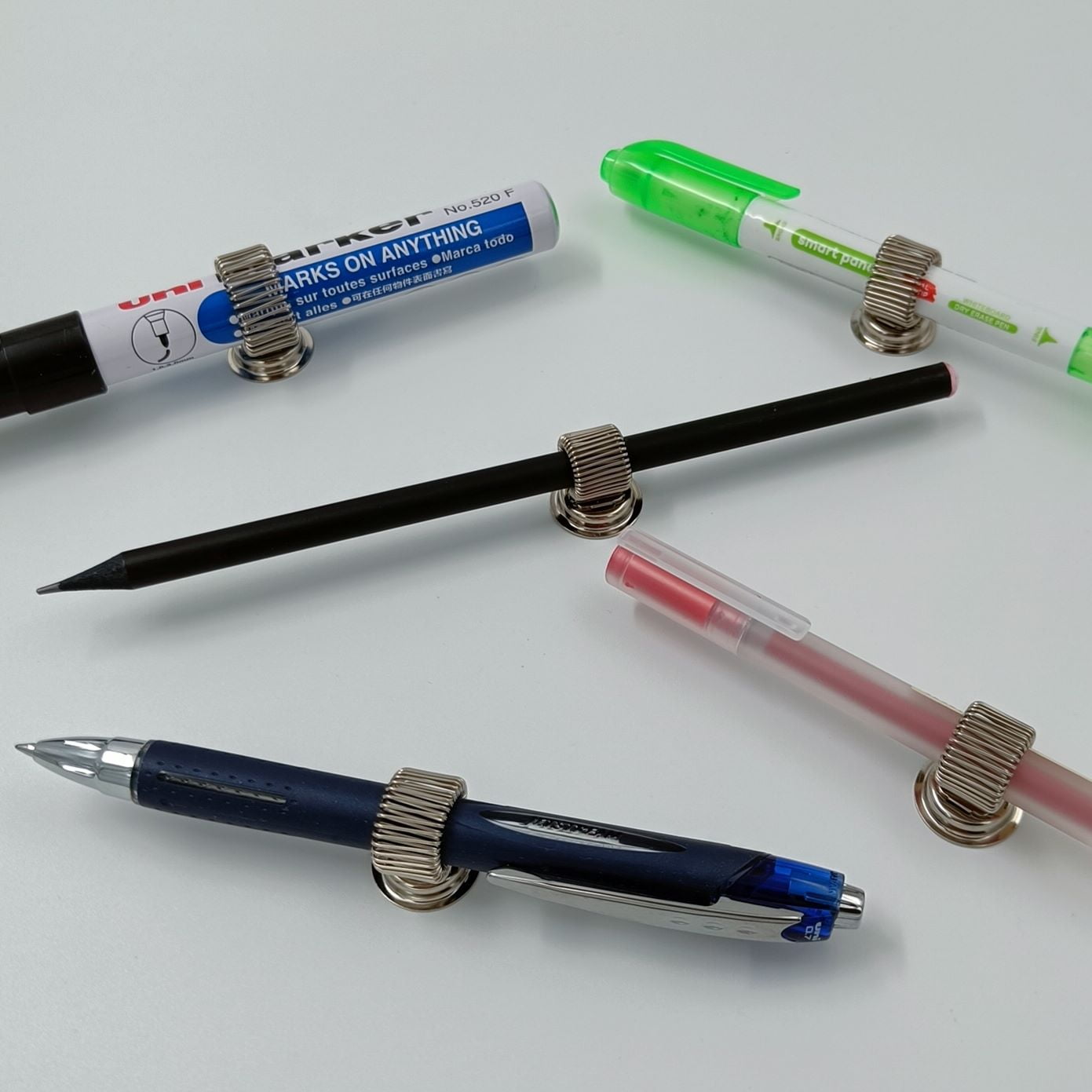Joustavalla lenkillä varustettu kynäteline jonka avulla saat lempikynäsi helposti saataville. Kynätelineessä on vahva neodyymimagneetti ja se kiinnittyy kaikkiin magneettisiin pintoihin. Kynäteline on optimaalisin käyttää 0,5 cm – 1 cm paksuisille kynille ja tusseille. Tätä paksumpikin tussi telineeseen mahtuu, mutta pujottaminen ja irrottaminen saattaa olla hankalampaa. Halutessaan telinettä ei ole pakko irrottaa paksummista tusseista, koska kirjoittaminen sujuu luontevasti vaikka teline olisi kiinni tussissa. Teline sopii loistavasti myös muille vastaaville tarvikkeille, kuten saksille.