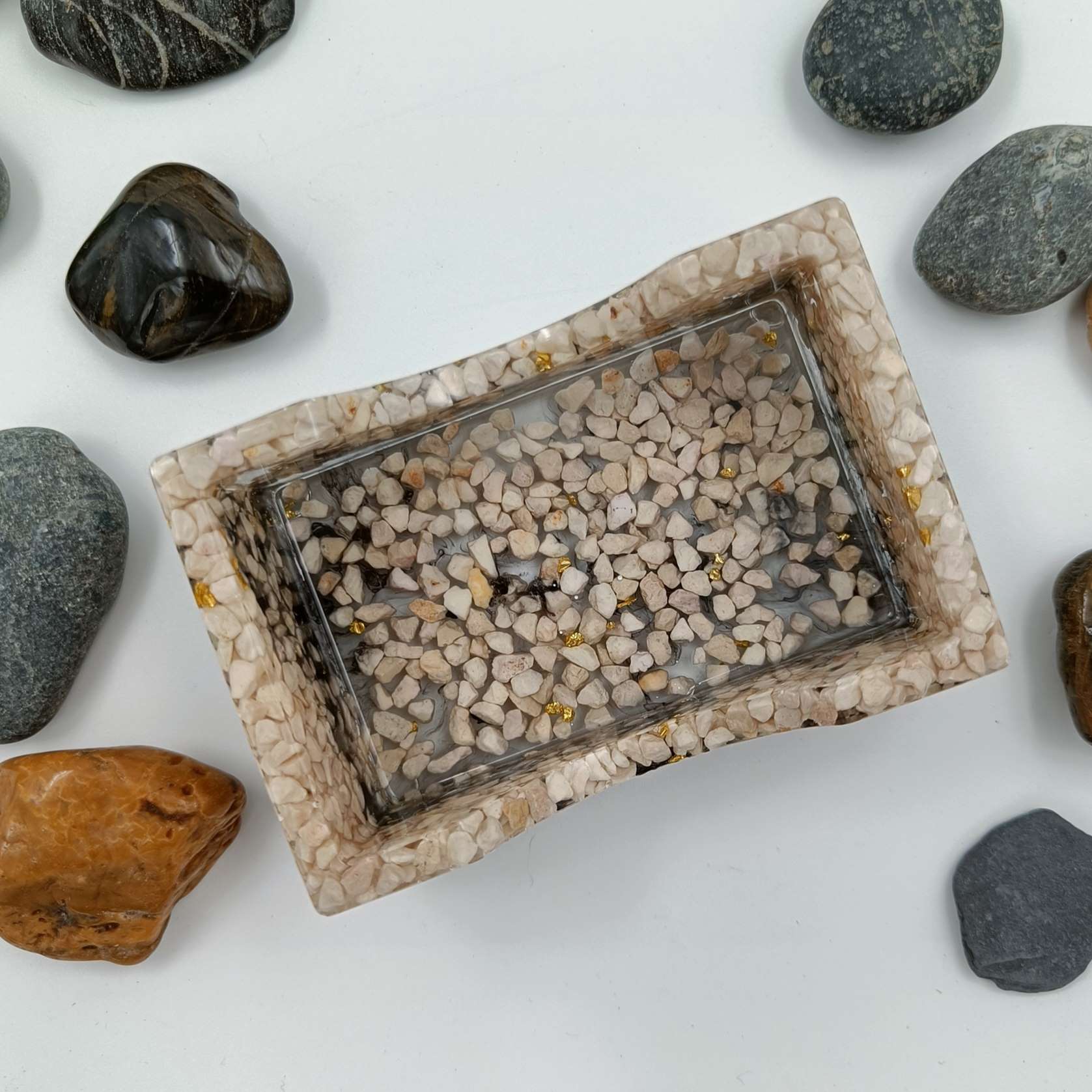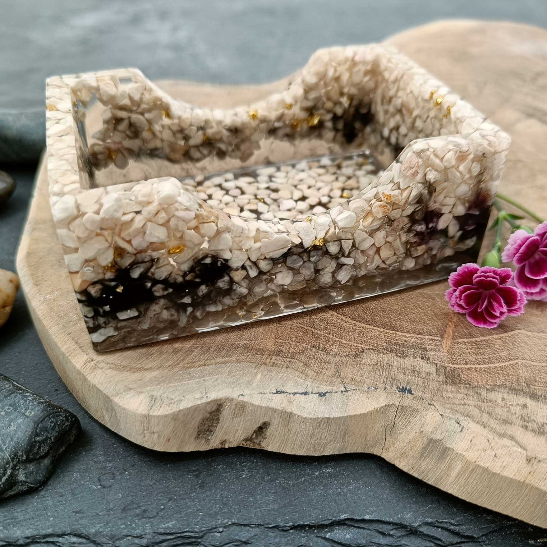 Maokan lasinalustelineissä käytetään vaihtelevasti erilaisia kiviä ja rouheita, sävyjä tummasta vaaleaan sekä kimaltelevia yksityiskohtia, jotka yhdistetään laadukkaan hartsin avulla upeaksi kiiltäväksi lopputulokseksi. Jokaisen lasinalusen pohjista löytyy pienet, kirkkaat silikonitassut, jotka ehkäisevät telineen liukumista pöytien ja tasojen päällä. Maokan neliskanttiseen lasinalustelineeseen mahtuu neljä lasinalusta säilytykseen.